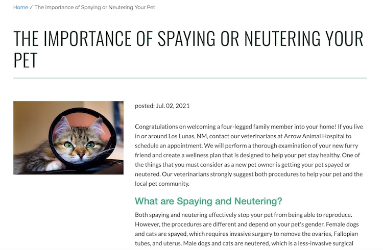 This client had a blog that was not getting much traffic. As a small animal hospital group in New Mexico, they were hoping to use the blog to help with client retention and increase their presence among locals in the area. I recognized the value of the content they were providing but also realized that it was not well optimized for SEO. And though the blog had been live for a few years, new articles were not regularly posted nor shared on social media. I also discovered that none the articles (nor any of the other website pages) had meta titles and descriptions, and most pages started with an H3 header instead of an H1.
